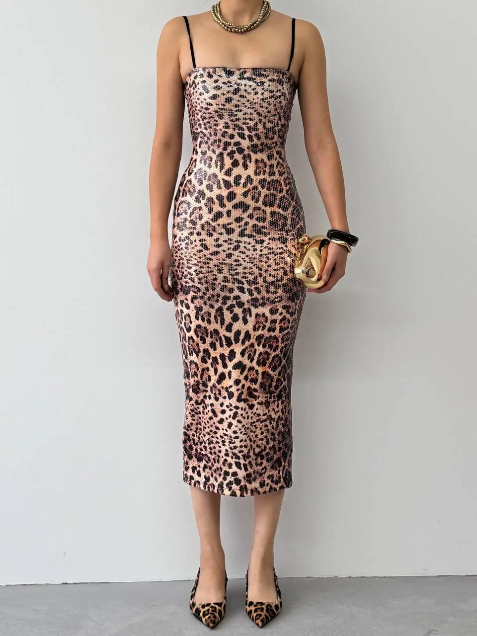 Στένο φόρεμα που αγκαλιάζει το σώμα. Εχει snake print και ραμμένες πούλιες σε όλο το ύφασμα.