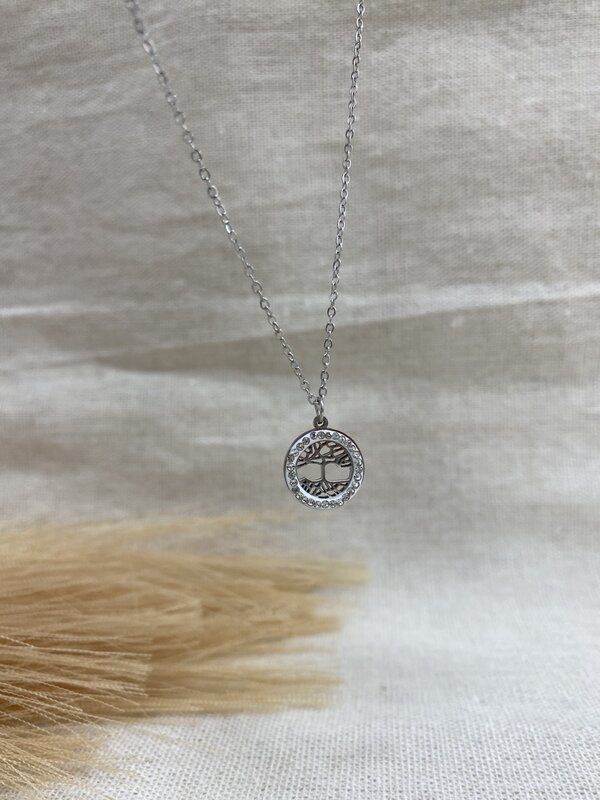Tree of Life in a circle decorated with rhinestones. A meaningful necklace.