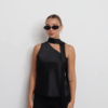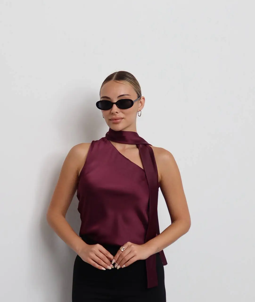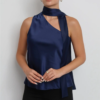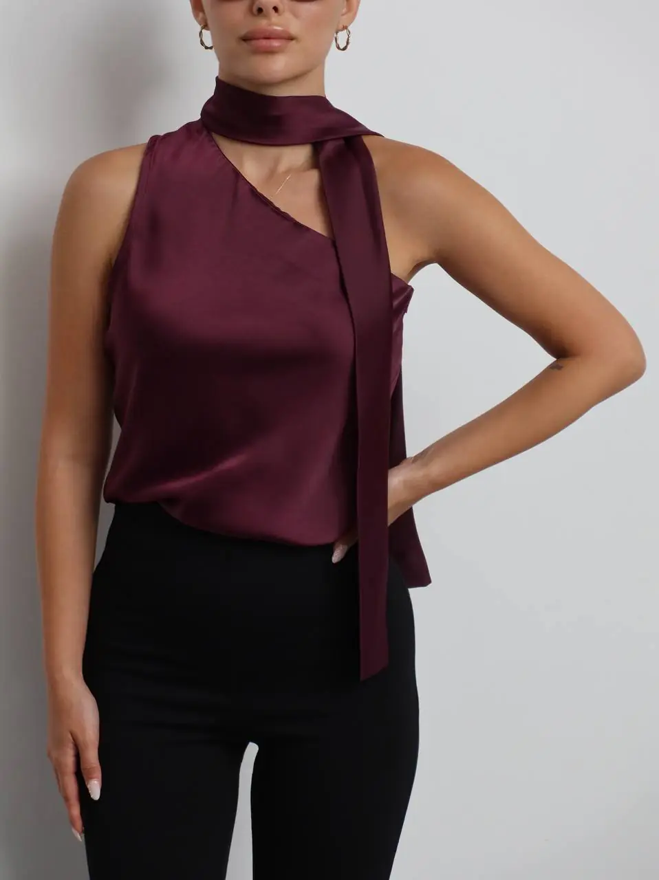Σατέν τοπ σε μωβ απόχρωση, με δεσιμο στο λαιμό και φερμουάρ στο πλάι.