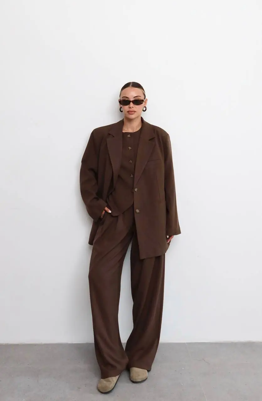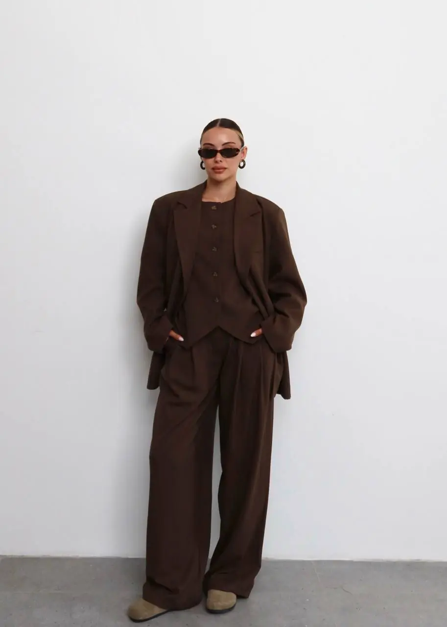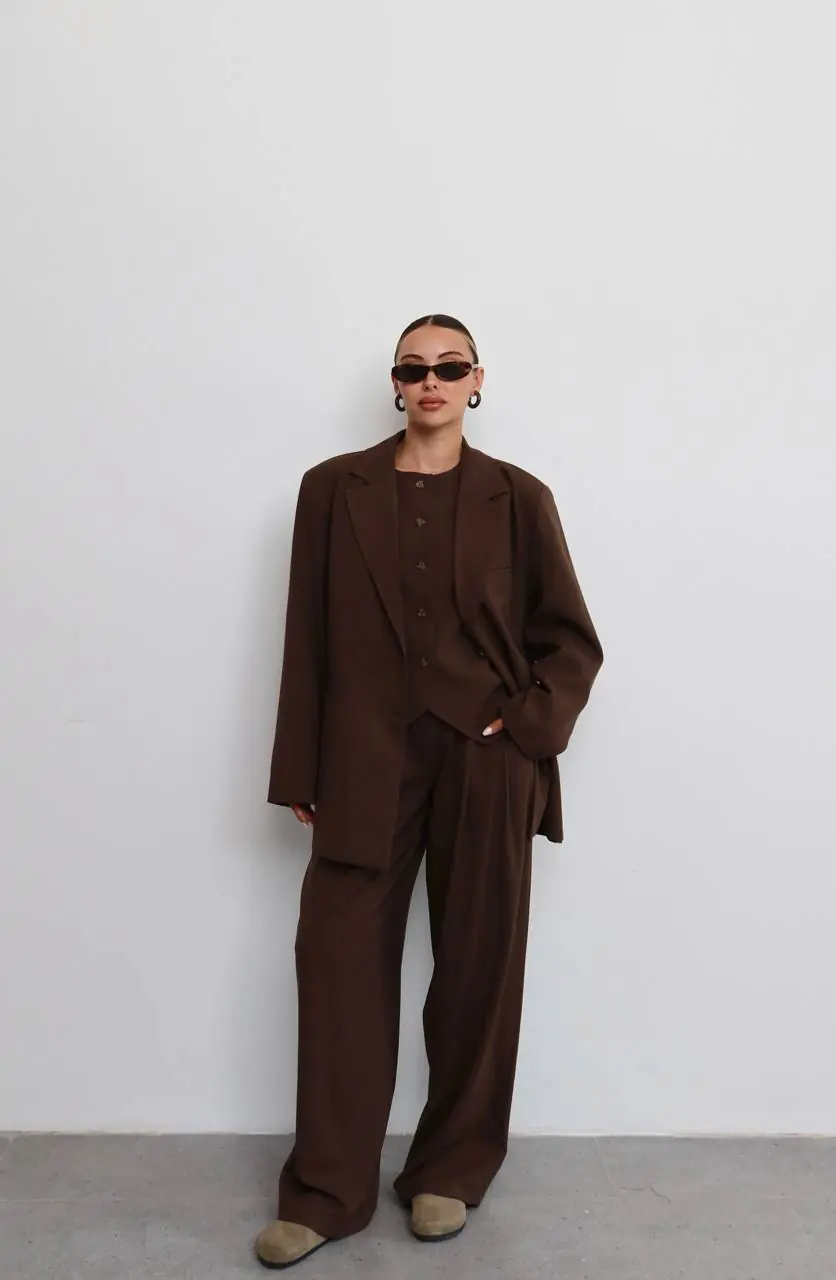 Σακάκι oversized με βάτες σε καφέ, απο 100% βαμβάκι. Δημιουργεί αυτο το ανδρόγυνο look που είναι στη μόδα.