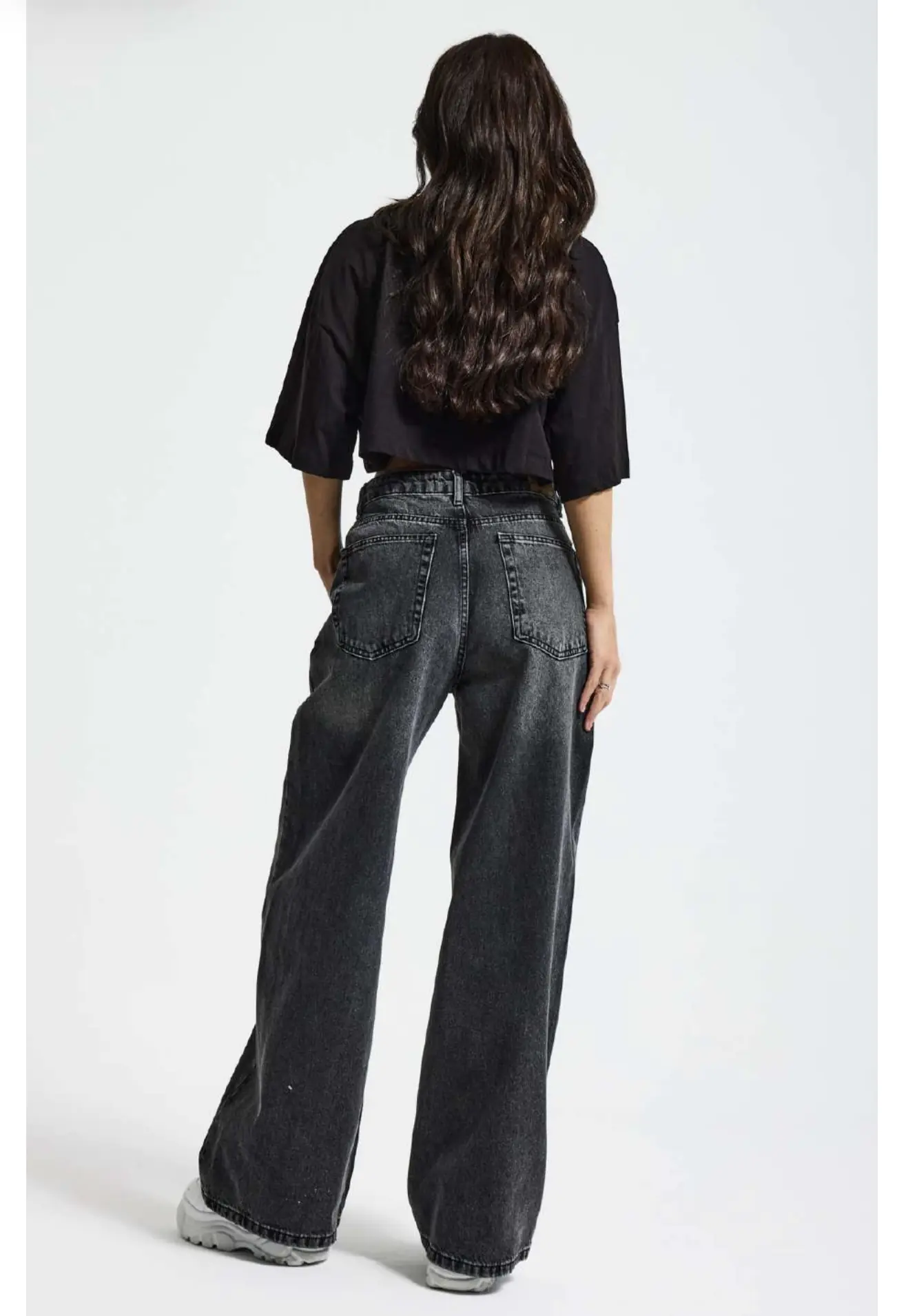 Ψηλόμεσο τζιν παντέλονι σε φαρδιά γραμμή. Από 100% βαμβάκι. Άνετο και στυλάτο.